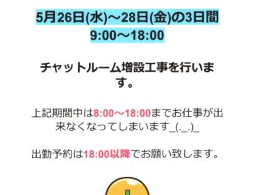 チャットルーム増設工事のお知らせ_(._.)_皆様、たくさんのお問合せ、ご応募、面接・体験にお越し頂きありがとうございます_( …